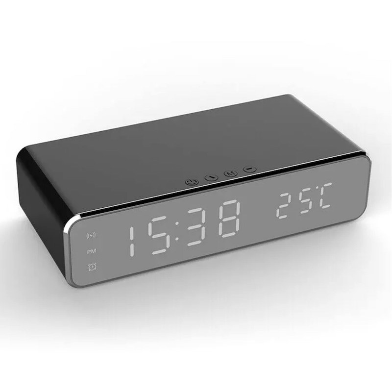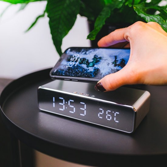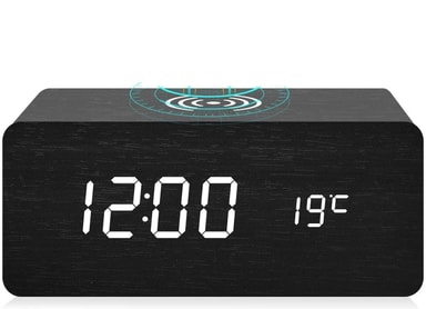 Smidig vckarklocka som ven fungerar som en QI laddare. Du kan stlla in upp till 3 olika vckningstider med 5 till 10 minuters intervall och du stnger av larmet genom att trycka p valfri knapp. Att ha en vckarklocka r ett skert stt att st upp varje morgon.